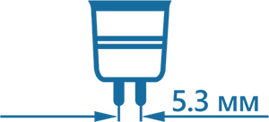 GU5.3 — штырьковый цоколь. Расстояние между центрами штырьков (контактов) 5.3 мм. Лампы с таким типом цоколя чаще всего применяют в освещении квартир и домов, встраивая их в потолок. |