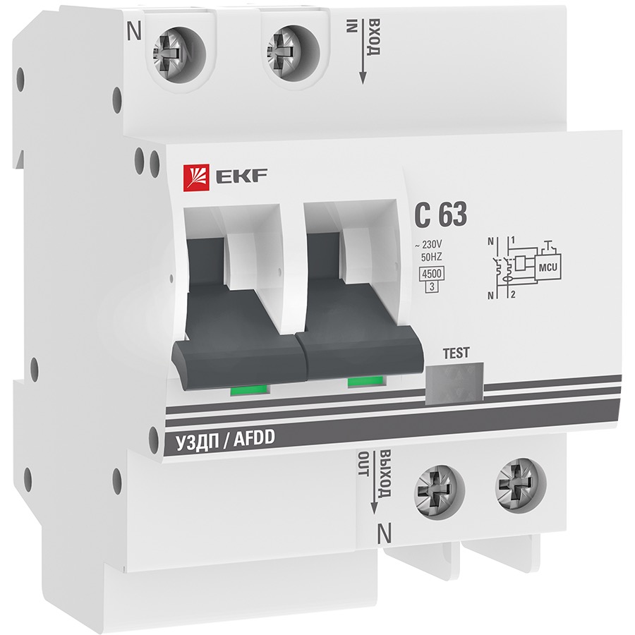 Устройство защиты от дугового пробоя (УЗДП) с автоматическим выключателем 2P 63А (C) 4,5кА 72 мм EKF PROxima, 1+N полюс, 63А, C, 4,5 кА