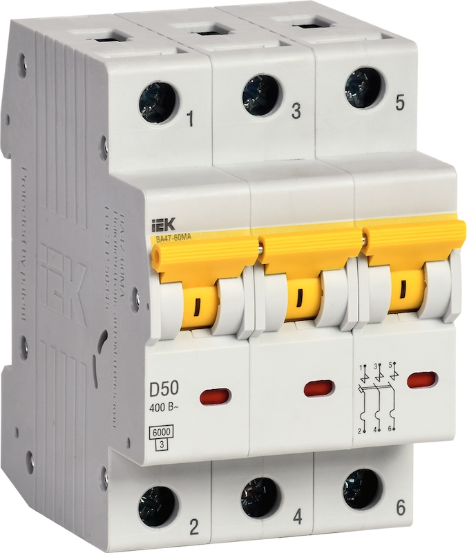 Автоматический выключатель без теплового расцепителя KARAT, 3 полюса, 50А, D, 6 кА
