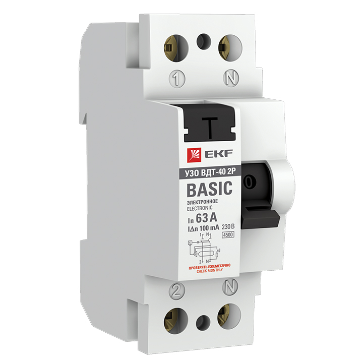 Устройство защитного отключения УЗО ВДТ-40 2P 63А/100мА (электронное) EKF Basic BASIC, 2 полюса, 63А, тип - AC, 100 мА