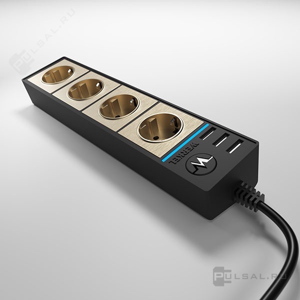 WL20-04-03 / Розеточный блок 4-х местный + 3 USB черный/шампань рифленый