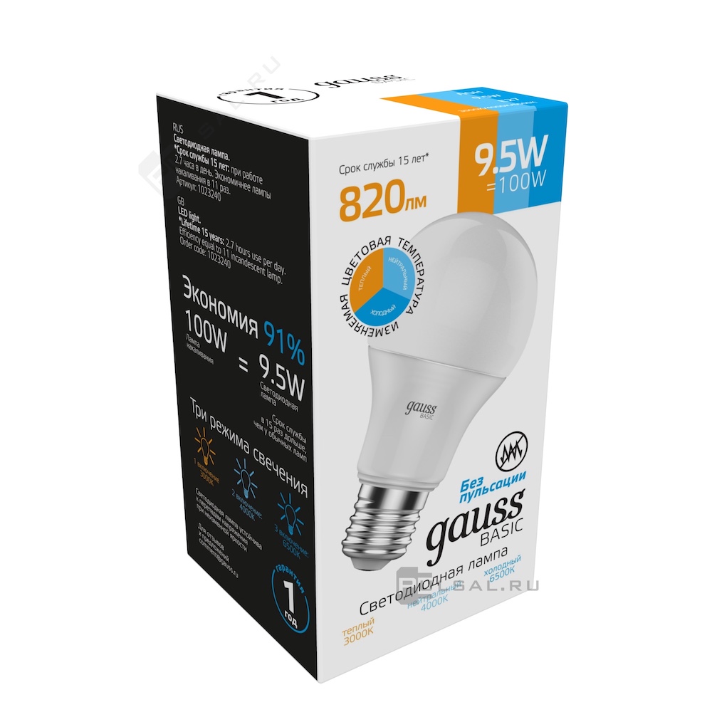 Лампа с переключаемой цветовой температурой светодиодная Basic, цоколь - E27, мощность - 9.5Вт, световой поток - 820Лм, цветовая температура - 3000+4000+6500К, не диммируется, 1023240, Gauss