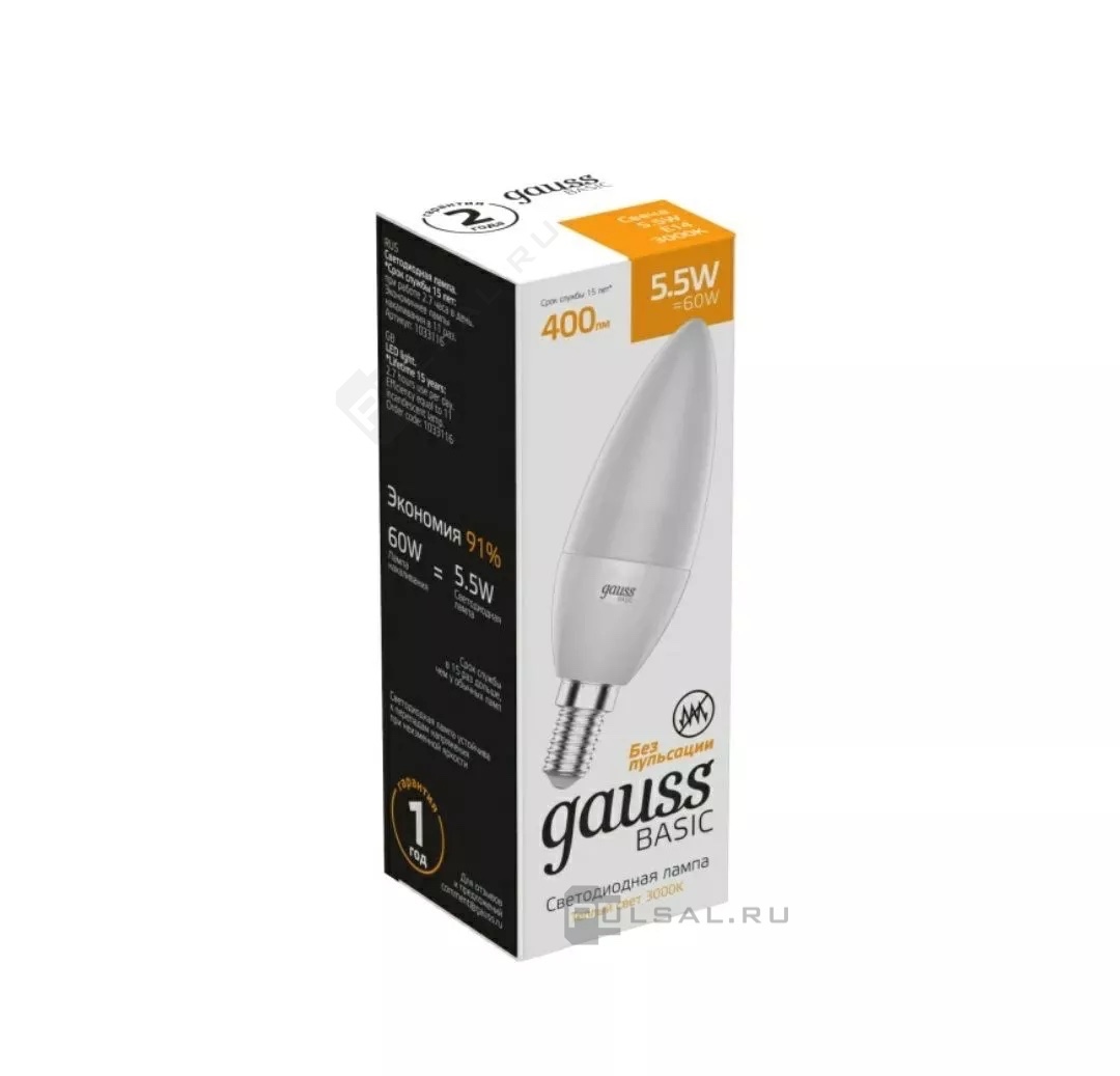 Лампа светодиодная Basic, цоколь - E14, мощность - 5.5Вт, световой поток - 400Лм, цветовая температура - 3000К, не диммируется, 1033116, Gauss