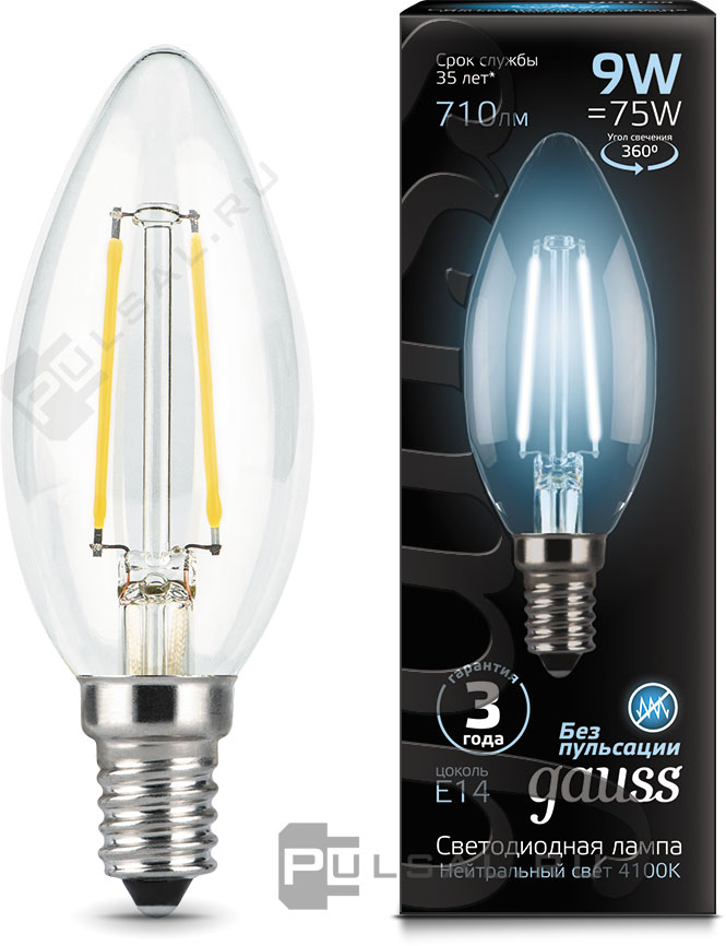 Лампа прозрачная филаментная Black, цоколь - E14, мощность - 9Вт, световой поток - 710Лм, цветовая температура - 4100К, не диммируется, 103801209, Gauss