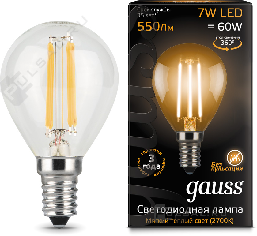 Лампа прозрачная филаментная Black, цоколь - E14, мощность - 7Вт, световой поток - 550Лм, цветовая температура - 2700К, не диммируется, 105801107, Gauss