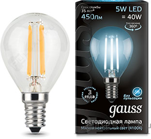 Лампа прозрачная филаментная Black, цоколь - E14, мощность - 5Вт, световой поток - 450Лм, цветовая температура - 4100К, не диммируется, 105801205, Gauss