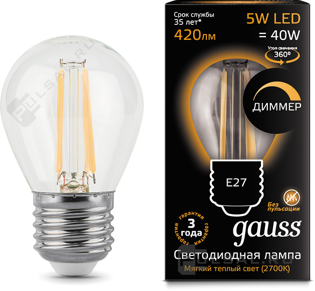 Лампа прозрачная филаментная Black, цоколь - E27, мощность - 5Вт, световой поток - 420Лм, цветовая температура - 2700К, диммируется, 105802105-D, Gauss