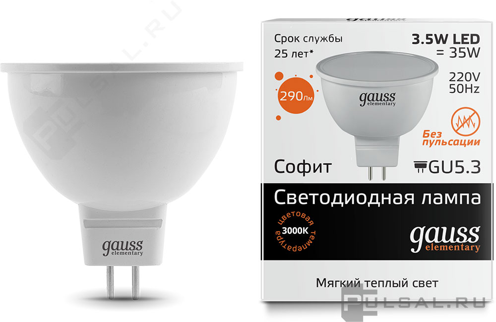 Лампа светодиодная Elementary, цоколь - GU5.3, мощность - 3.5Вт, световой поток - 290Лм, цветовая температура - 3000К, не диммируется, 13514, Gauss