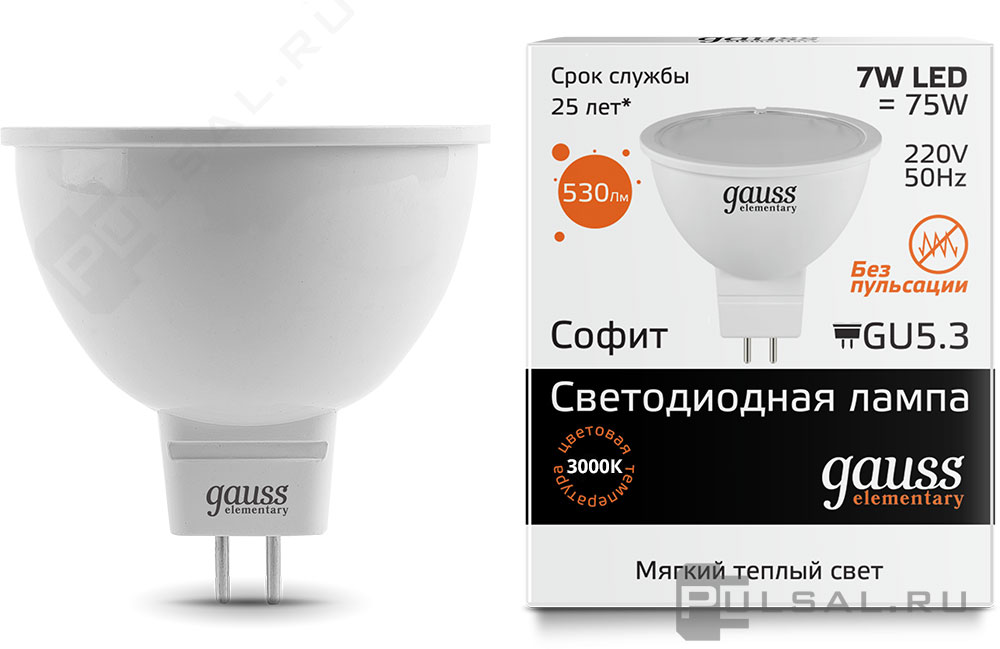 Лампа светодиодная Elementary, цоколь - GU5.3, мощность - 7Вт, световой поток - 530Лм, цветовая температура - 3000К, не диммируется, 13517, Gauss