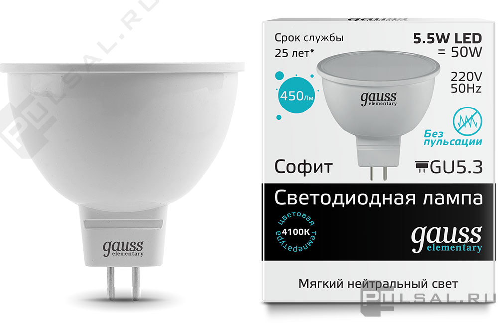 Лампа светодиодная Elementary, цоколь - GU5.3, мощность - 5.5Вт, световой поток - 450Лм, цветовая температура - 4100К, не диммируется, 13526, Gauss