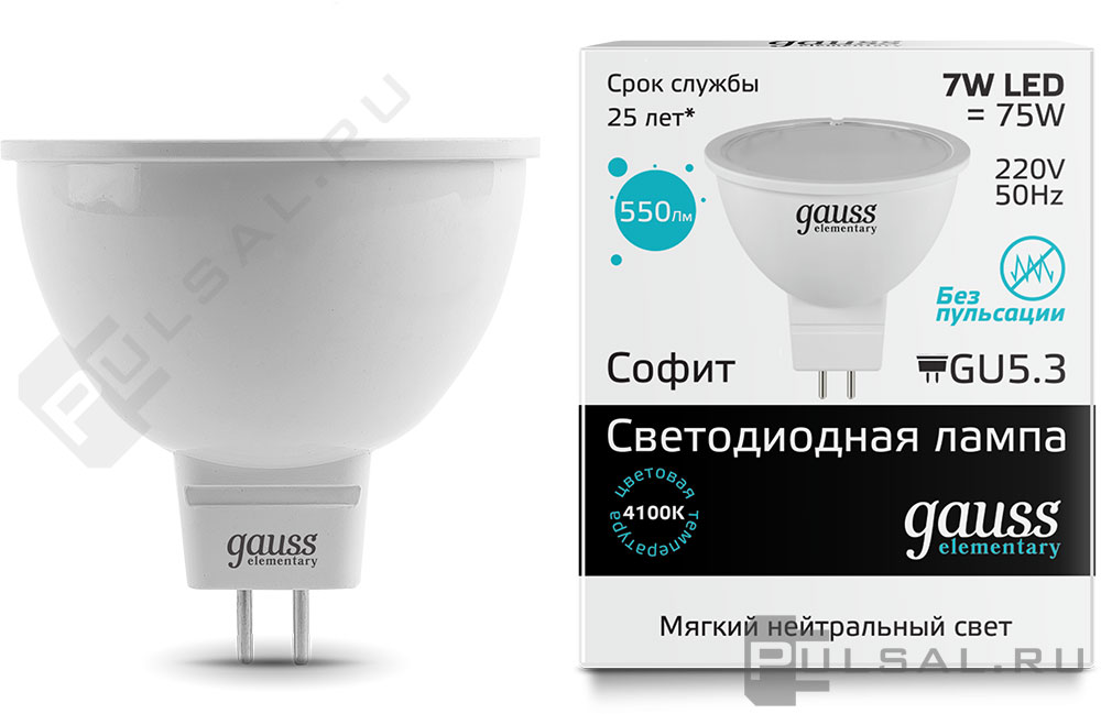Elementary, цоколь - GU5.3, мощность - 9Вт, световой поток - 660Лм, цветовая температура - 4100К, не диммируется, 13529, Gauss