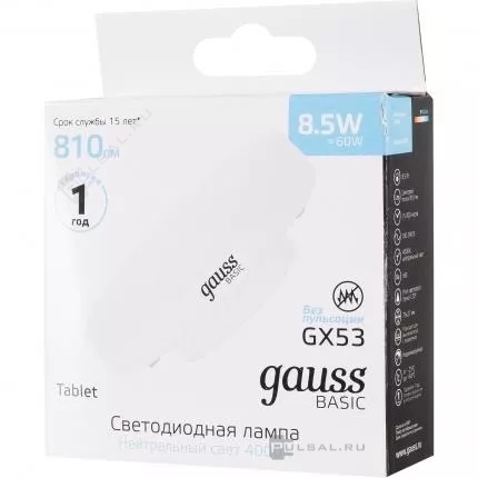 Лампа светодиодная Basic, цоколь - GX53, мощность - 8Вт, световой поток - 810Лм, цветовая температура - 4000Кцветовая температура - 4100К, не диммируется, 20849292, Gauss