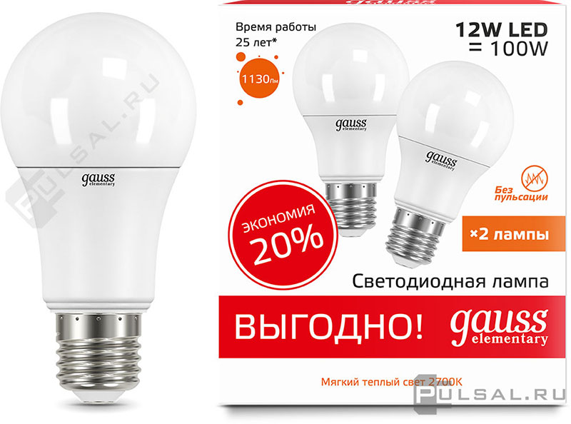 Elementary, цоколь - E27, мощность - 12Вт, световой поток - 1130Лм, цветовая температура - 3000К, не диммируется, 23212, Gauss