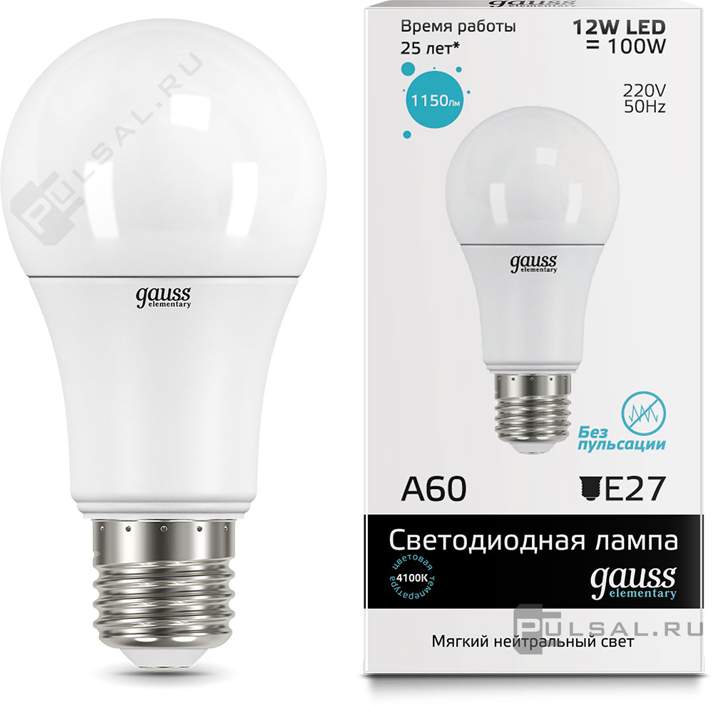 Лампа светодиодная Elementary, цоколь - E27, мощность - 12Вт, световой поток - 1150Лм, цветовая температура - 4100К, не диммируется, 23222, Gauss