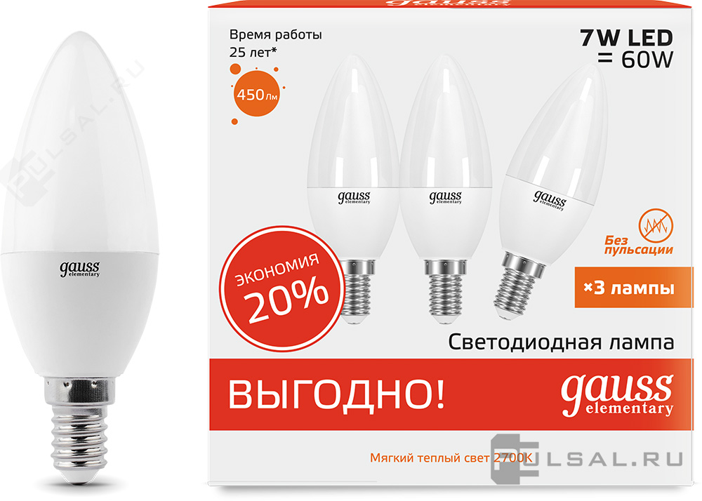 Лампа (3 лампы в упаковке) светодиодная Elementary, цоколь - E14, мощность - 7Вт, световой поток - 450Лм, цветовая температура - 2700Кцветовая температура - 3000К, не диммируется, 33117T, Gauss