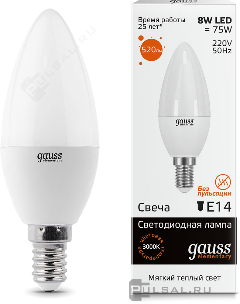 Лампа светодиодная Elementary, цоколь - E14, мощность - 8Вт, световой поток - 520Лм, цветовая температура - 3000К, не диммируется, 33118, Gauss
