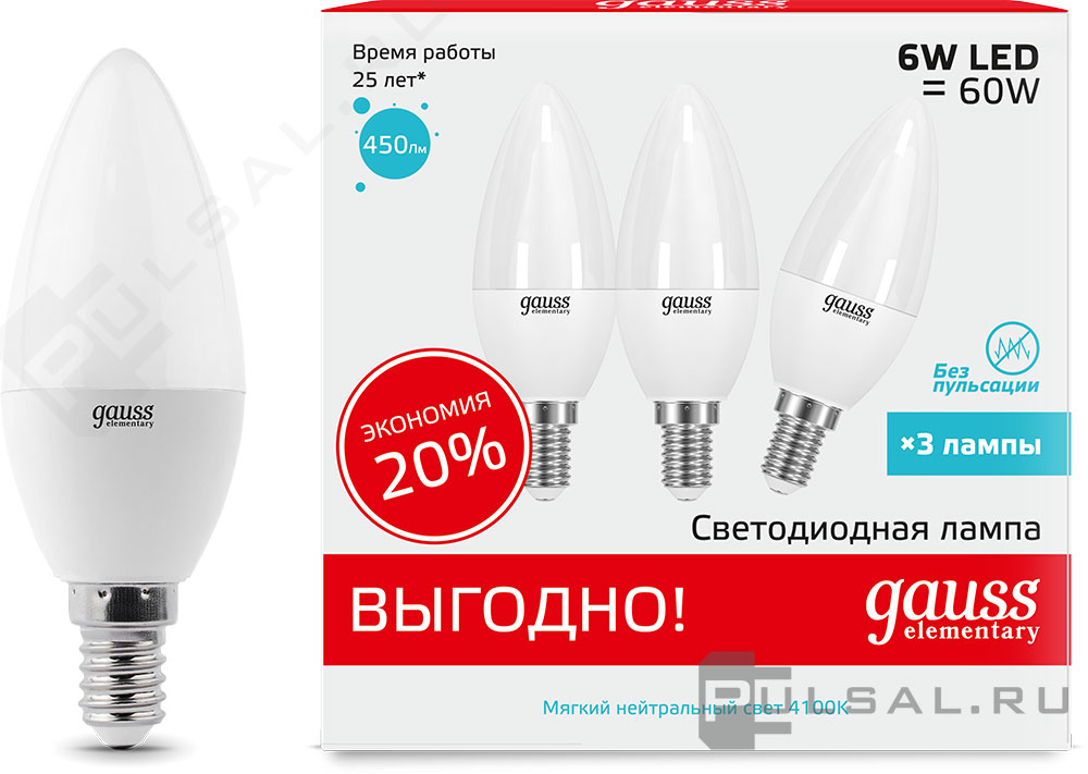 Лампа (3 лампы в упаковке) светодиодная Elementary, цоколь - E14, мощность - 6Вт, световой поток - 450Лм, цветовая температура - 4100К, не диммируется, 33126T, Gauss
