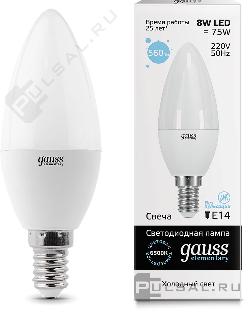Лампа светодиодная Elementary, цоколь - E14, мощность - 8Вт, световой поток - 560Лм, цветовая температура - 6500К, не диммируется, 33138, Gauss