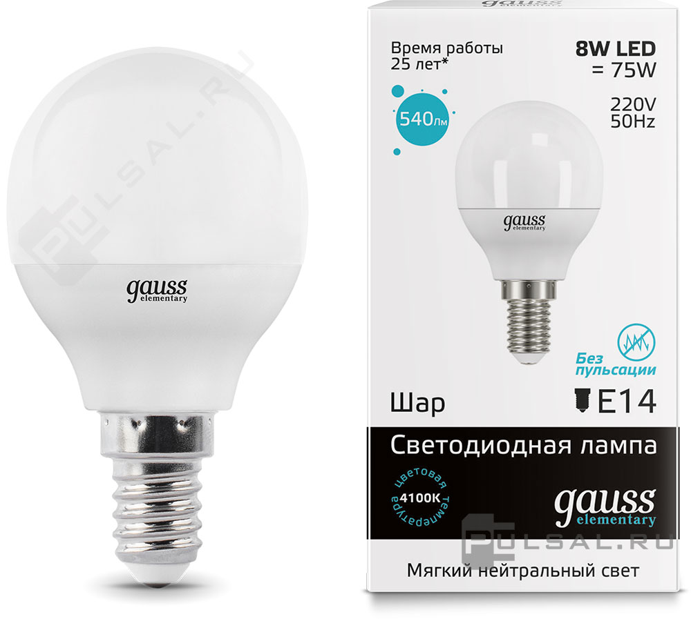 Elementary, цоколь - E14, мощность - 8Вт, световой поток - 540Лм, цветовая температура - 4100К, не диммируется, 34128, Gauss