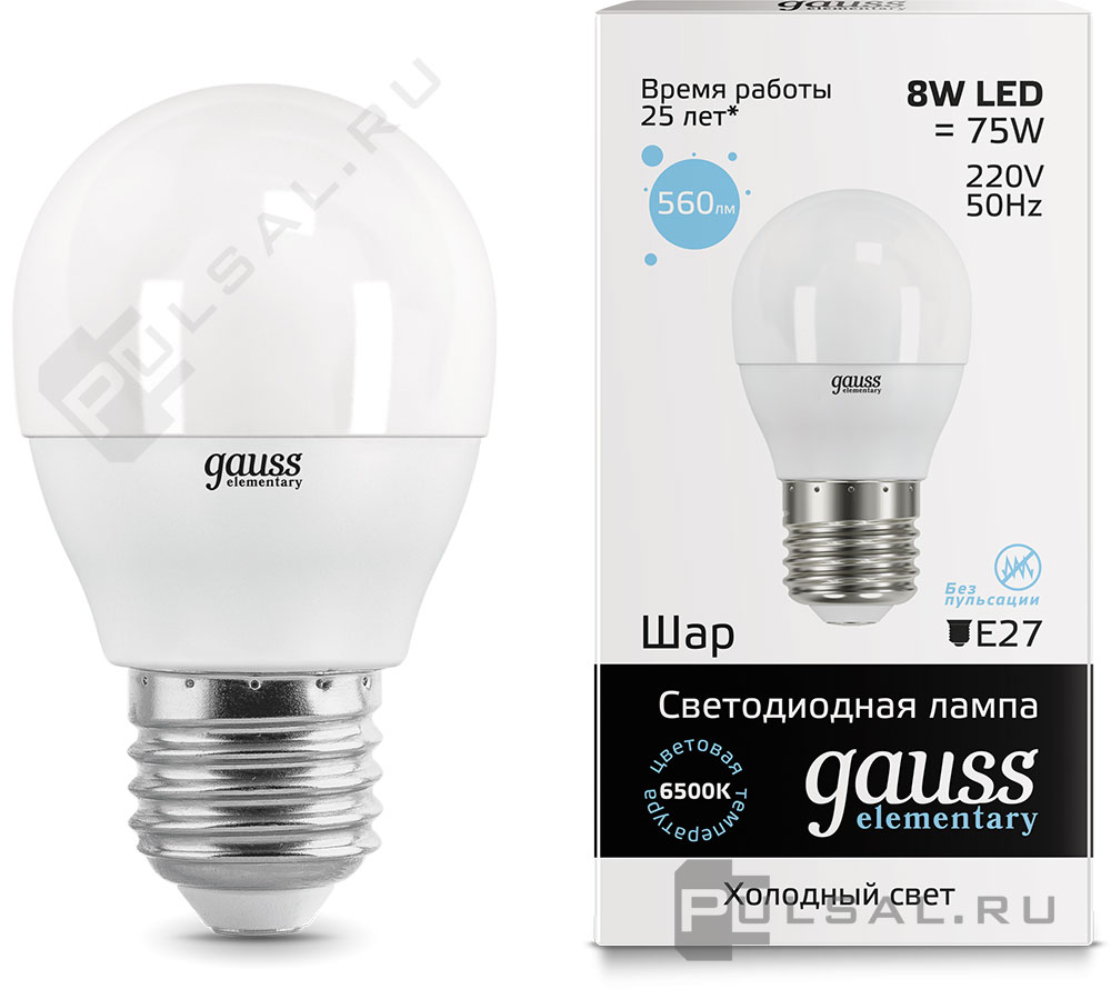 Лампа светодиодная Elementary, цоколь - E27, мощность - 8Вт, световой поток - 560Лм, цветовая температура - 6500К, не диммируется, 53238, Gauss