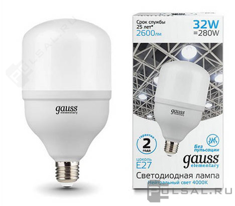 Лампа светодиодная Elementary, цоколь - E27, мощность - 32Вт, световой поток - 2600Лм, цветовая температура - 4000К, не диммируется, 63223, Gauss