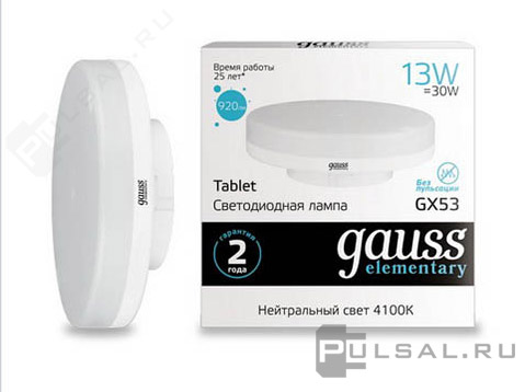 Лампа светодиодная Elementary, цоколь - GX53, мощность - 13Вт, световой поток - 920Лм, цветовая температура - 4100К, не диммируется, 83823, Gauss