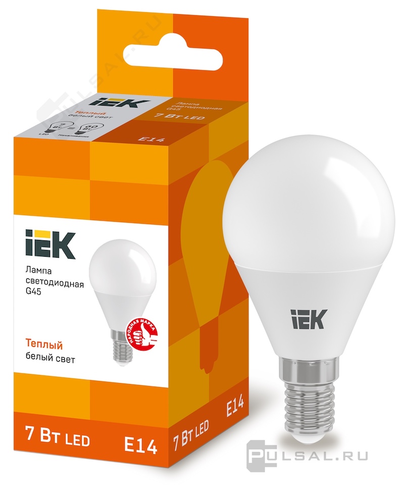 Лампа светодиодная Лампы IEK, цоколь - E14, мощность - 7Вт, световой поток - 630Лм, цветовая температура - 3000К, не диммируется, LLE-G45-7-230-30-E14, IEK