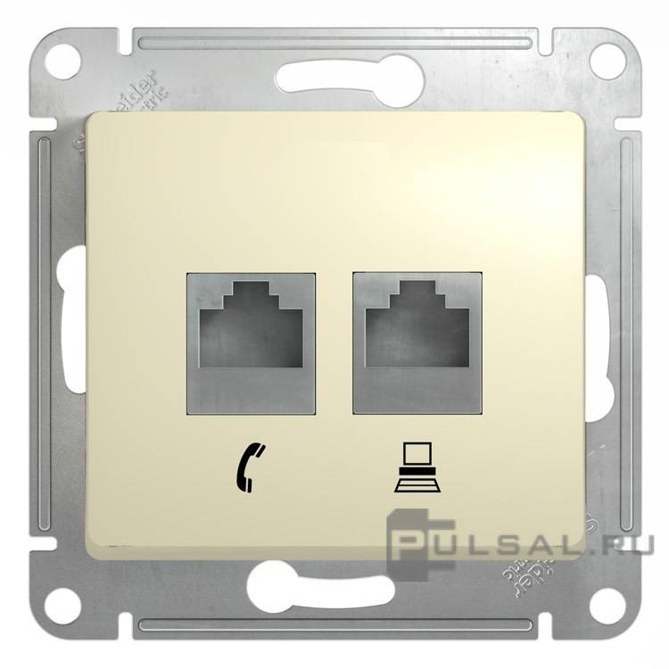 Розетка телефонная RJ11 + компьютерная RJ45 Cat.5e (UTP) Glossa, двойная, цвет - бежевый