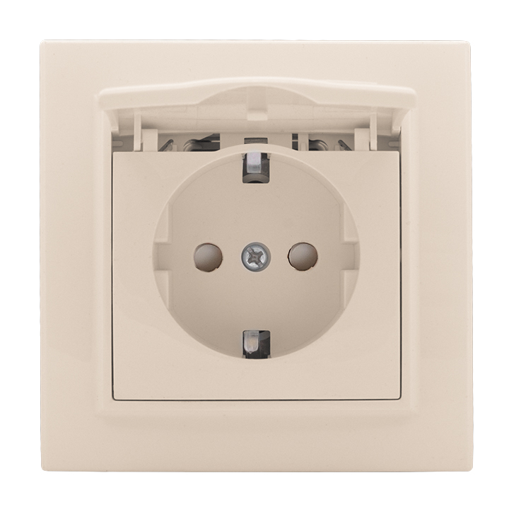 Розетка Минск, со шторками, с крышкой, с заземлением, одинарная, безвинтовые клеммы, цвет - бежевый