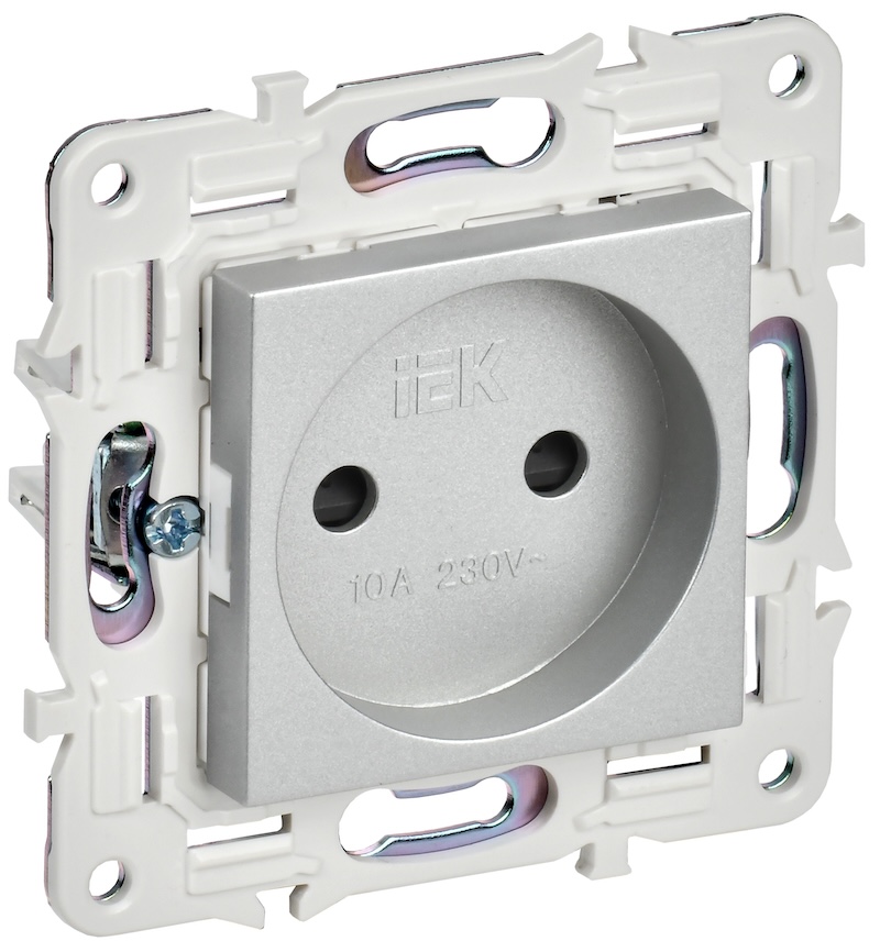 Розетка Skandy, со шторками, без заземления, одинарная, винтовые клеммы, цвет - серебряный