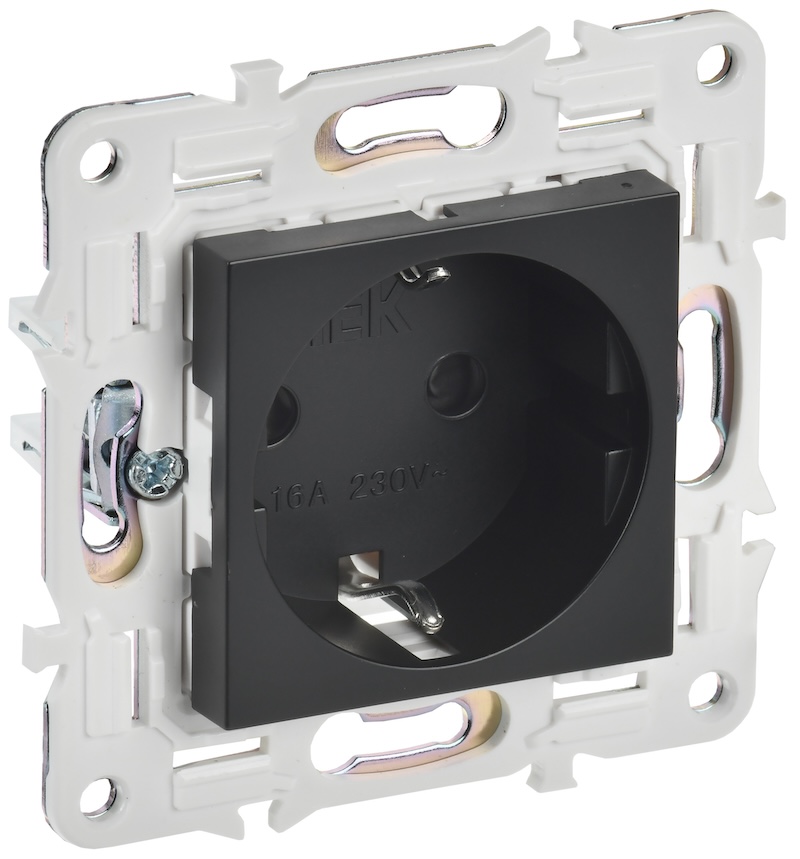 Розетка Skandy, со шторками, с заземлением, одинарная, винтовые клеммы, цвет - черный