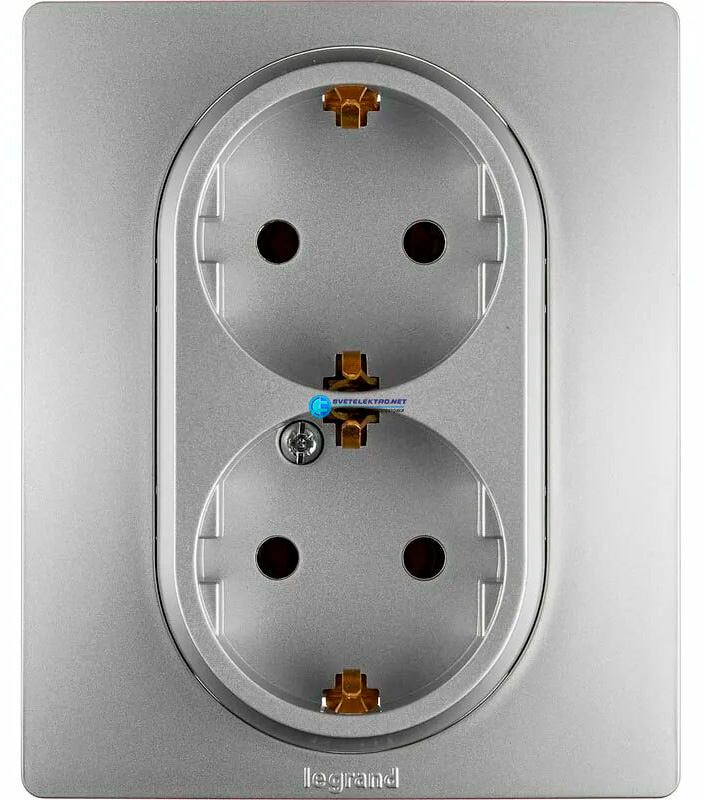 Розетка Etika, без шторок, с заземлением, двойная, винтовые клеммы, цвет - алюминий