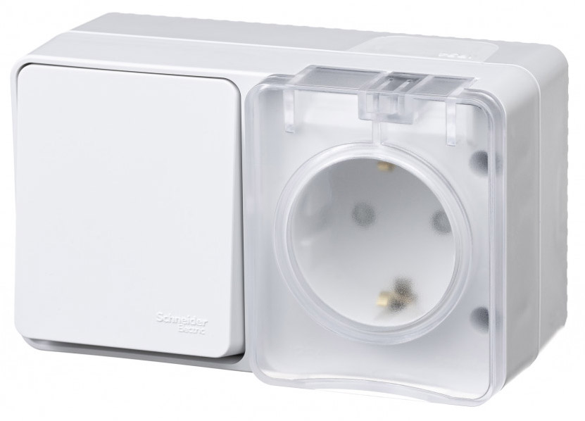 Блок, розетка + выключатель Atlas Design Profi 54, со шторками, с крышкой, с заземлением, одинарная, винтовые клеммы, цвет - белый
