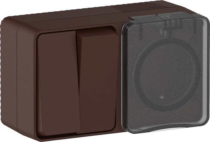 Блок, розетка + выключатель Atlas Design Profi 54, со шторками, с крышкой, с заземлением, одинарная, винтовые клеммы, цвет - коричневый