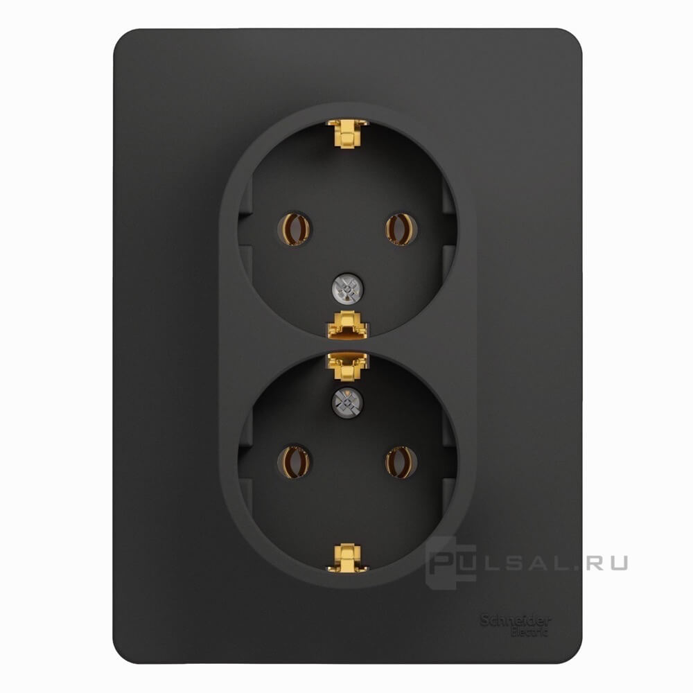 Розетка Glossa, без шторок, с заземлением, двойная, винтовые клеммы, цвет - антрацит