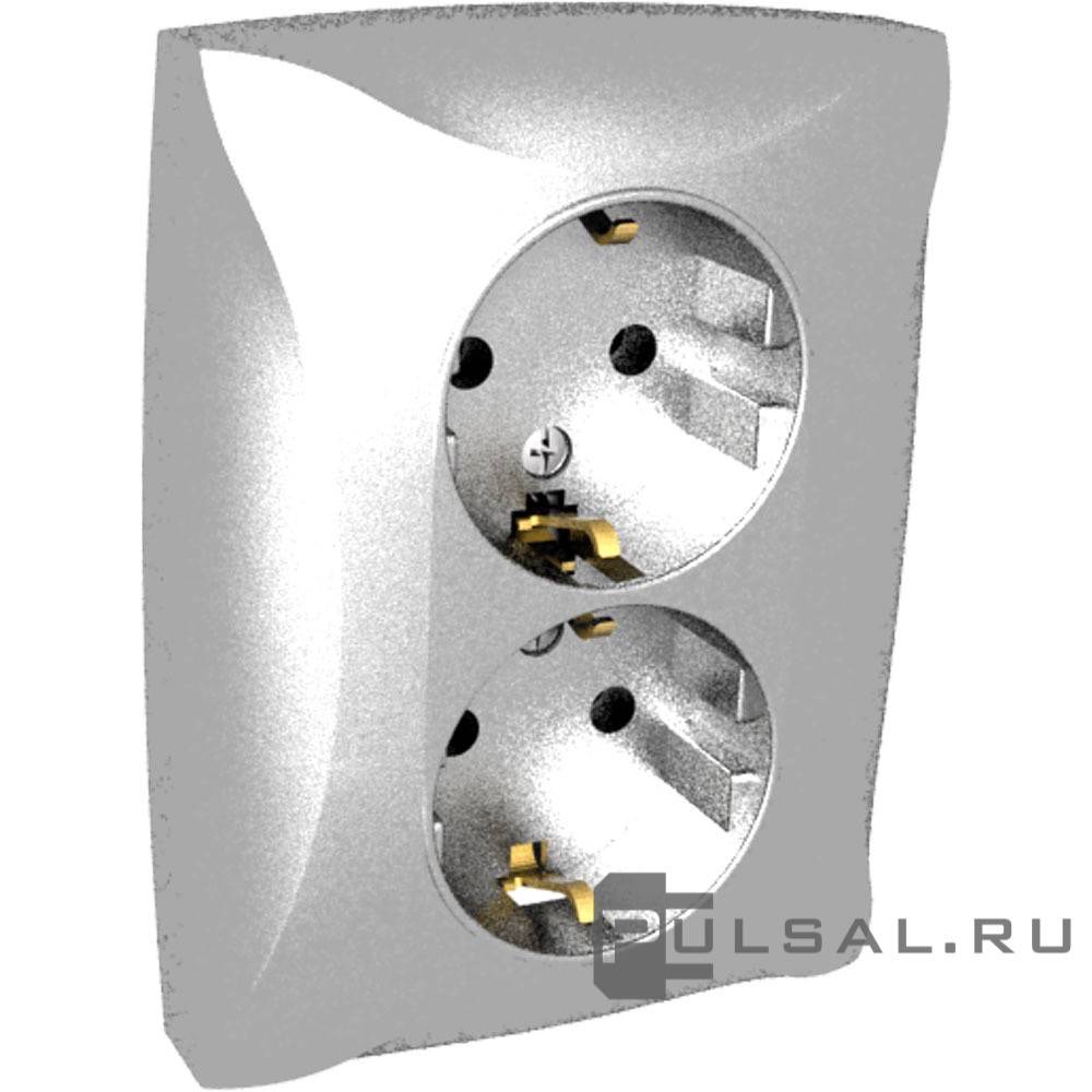 Розетка Дуэт, без шторок, с заземлением, двойная, винтовые клеммы, цвет - серебристый