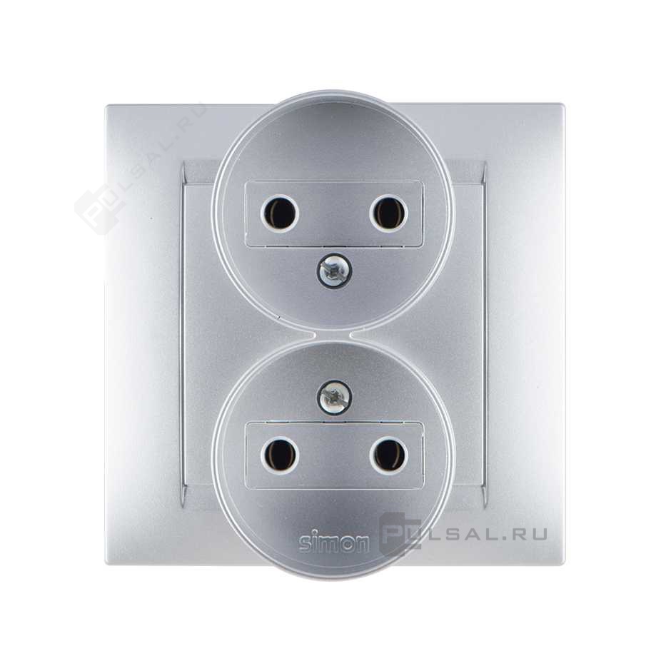 Розетка моноблок Simon 15, без шторок, без заземления, двойная, винтовые клеммы, цвет - алюминий