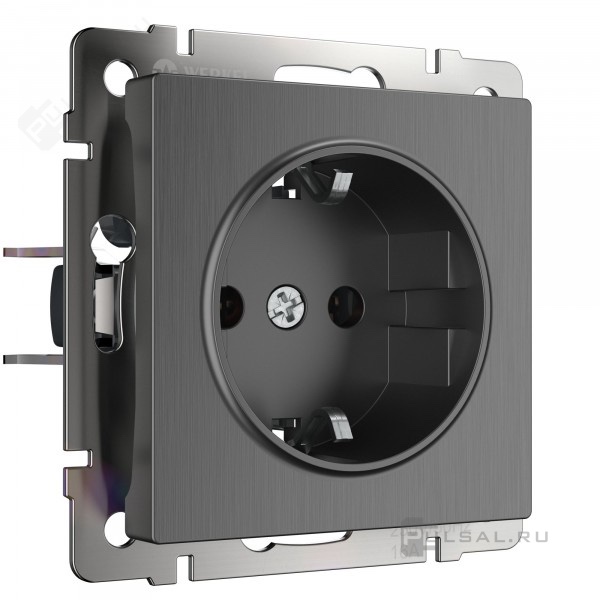 Розетка Alumax, Split, Slab, Senso, Baguette, Acrylic, Platinum, Elite, Snabb, Stream, Flock, Stark, Fiore, Favorit, Diamant, Aluminium, Antik, Metallic, со шторками, с заземлением, одинарная, винтовые клеммы, цвет - графит рифленый