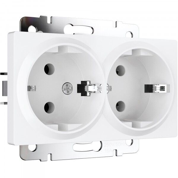 Розетка Alumax, Slab, Senso, Baguette, Acrylic, Platinum, Elite, Snabb, Stream, Flock, Stark, Fiore, Favorit, Diamant, Aluminium, Antik, Metallic, без шторок, с заземлением, двойная, винтовые клеммы, цвет - белый матовый