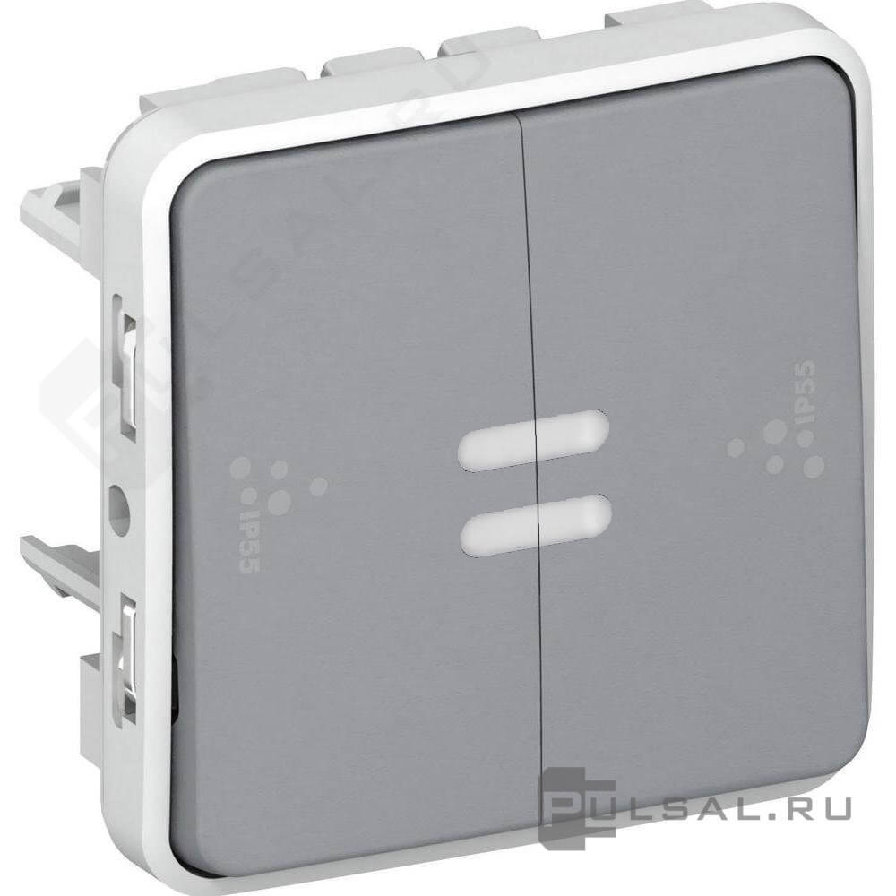 Переключатель Plexo, двухклавишный, с подсветкой, цвет - серый