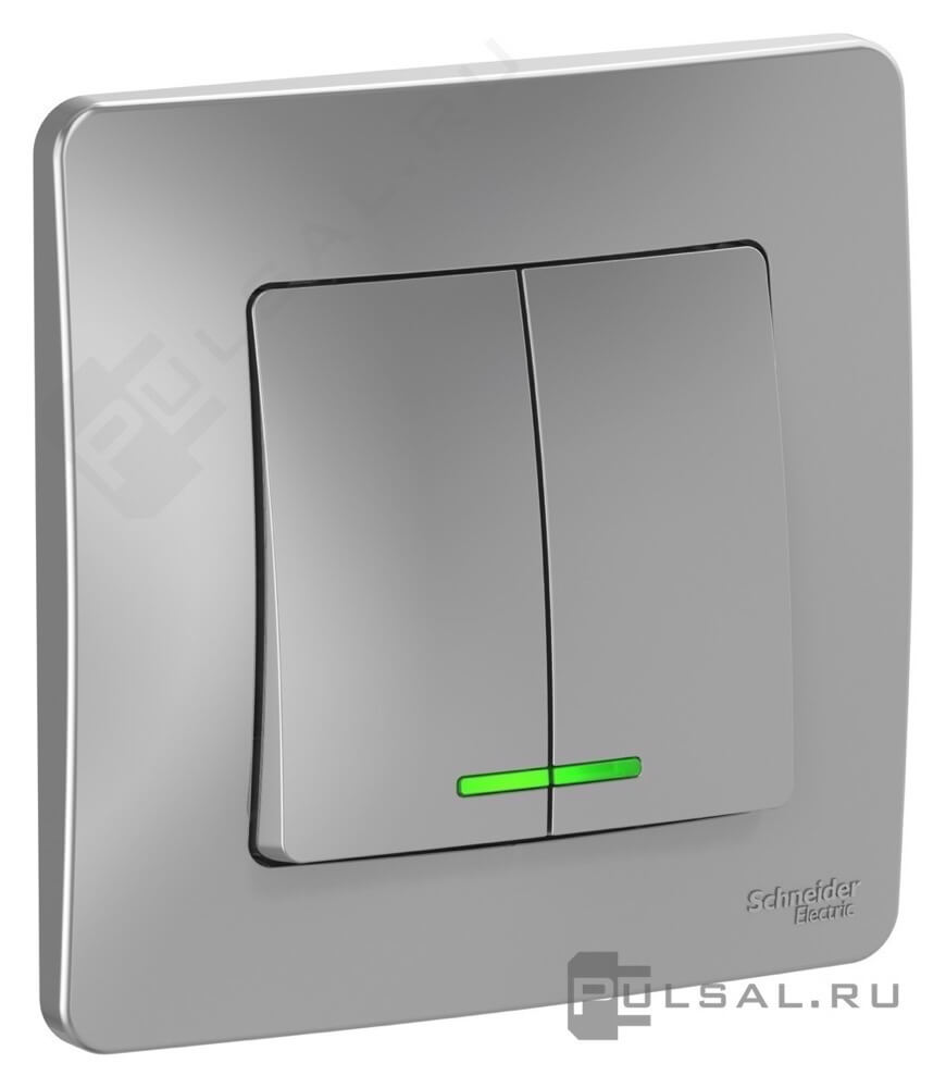 Выключатель 10 А Blanca, двухклавишный, с подсветкой, цвет - алюминий