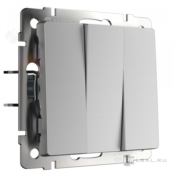 Выключатель Alumax, Split, Slab, Senso, Baguette, Acrylic, Platinum, Elite, Snabb, Stream, Flock, Stark, Fiore, Favorit, Diamant, Aluminium, Antik, Metallic, трехклавишный, без подсветки, цвет - серебряный
