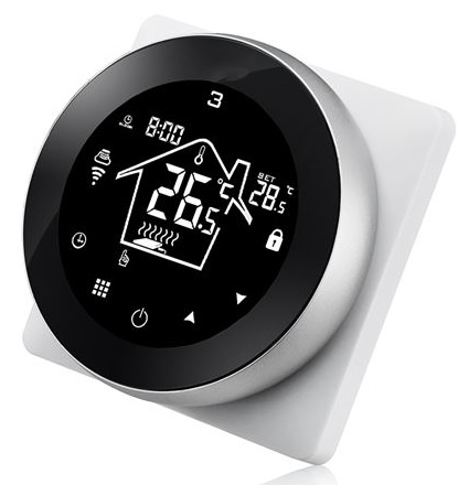 Термостат с Wi-Fi с датчиком температуры пола, 16 A Универсальные устройства и механизмы, сенсорный, управление по wi-fi, датчик t° воздуха (встроенный), датчик t° пола (внешний), с таймером, цвет - черное стекло, серебро