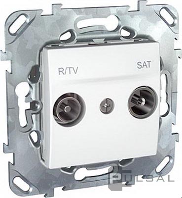 Розетка проходная 13 dB Unica Базовая, Unica Хамелеон, Unica Quadro, телевизионная (TV), спутниковая (SAT), радио (R), двойная, цвет - белый