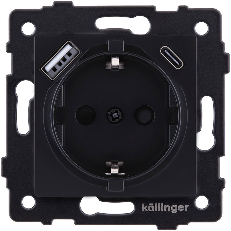Розетка USB A+C 2.4А с электрической розеткой Aspekt, Eleganz, Reflex, USB type-C 5V, USB type-A 5V, двойная, цвет - Чёрный матовый