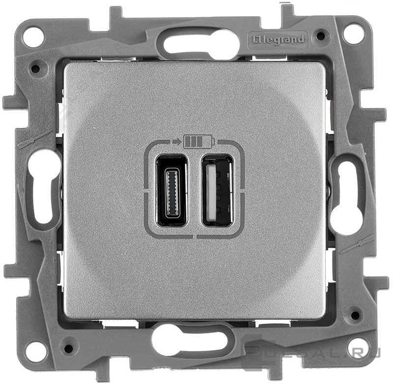 Розетка USB type-C + type-A, 3.0А Etika, USB type-C 5V, USB type-A 5V, двойная, цвет - алюминий