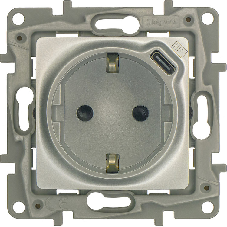 Электрическая розетка с USB type-C, 1,5A, 7,5Вт Etika, USB type-C 5V, Электр. с USB, одинарная, цвет - алюминий