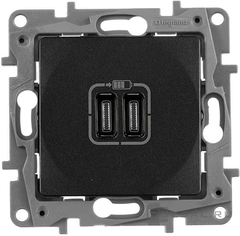 Розетка USB type-C, 3.0А Etika, USB type-C 5V, двойная, цвет - антрацит