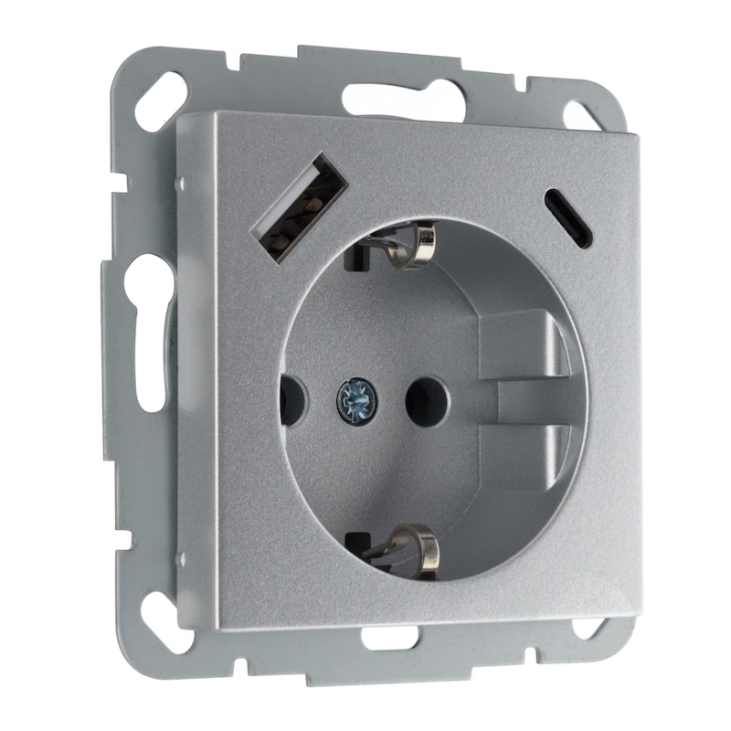 Розетка USB A+C, 3.4А с электрической розеткой Epsilon, Retro Liregus, USB type-C 5V, USB type-A 5V, двойная, цвет - алюминий