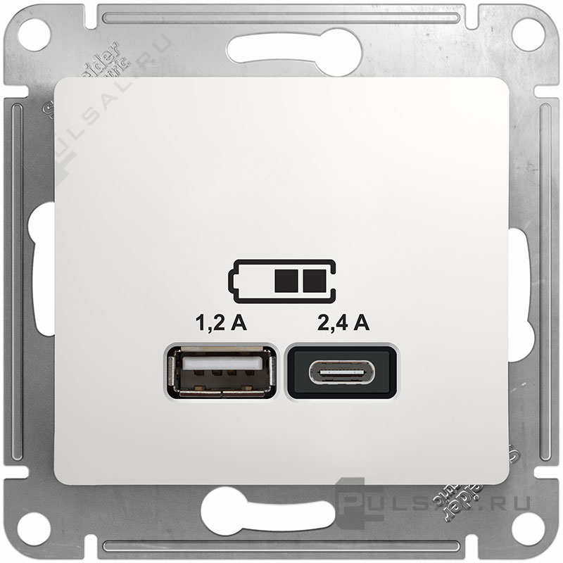 Розетка USB type-C + type-A, 2.4А Glossa, USB type-C 5V, USB type-A 5V, двойная, цвет - белый